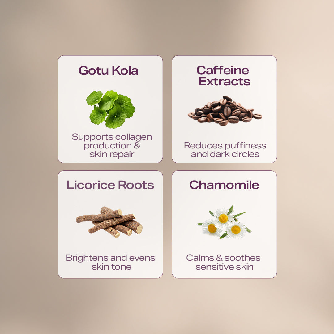 Infused with a potent blend of botanical extracts, this formula features Caffeine Extract, which reduces puffiness, minimizes dark circles, and improves microcirculation, bringing vitality back to tired eyes. Licorice Root Extract works to brighten and even out skin tone, while Gotu Kola and Chamomile Extracts provide a soothing, anti-inflammatory effect to keep the under-eye area calm and refreshed.